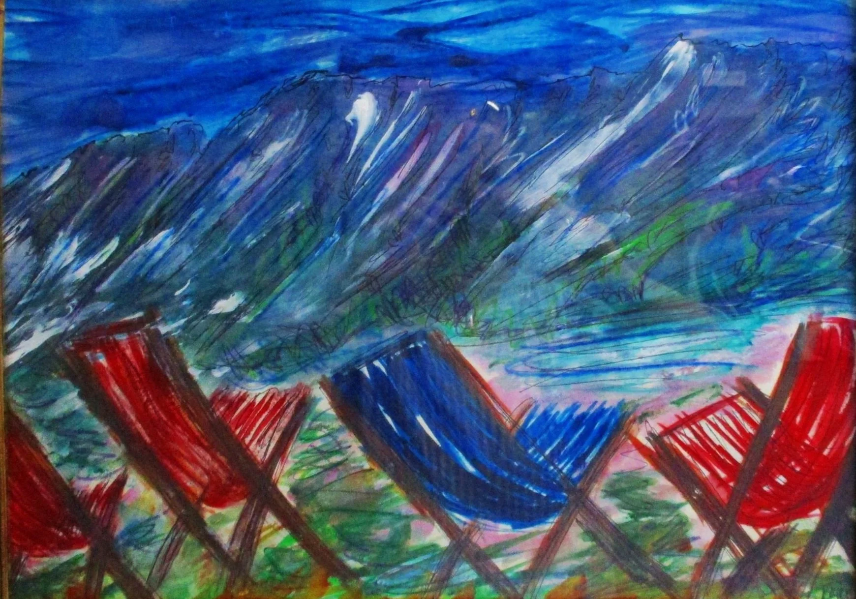Liegestuhl- Auszeit in luftiger Höh´, Aquarell mit Acryl und Fineliner auf Aquarellpapier, ohne Rahmen, 130, -