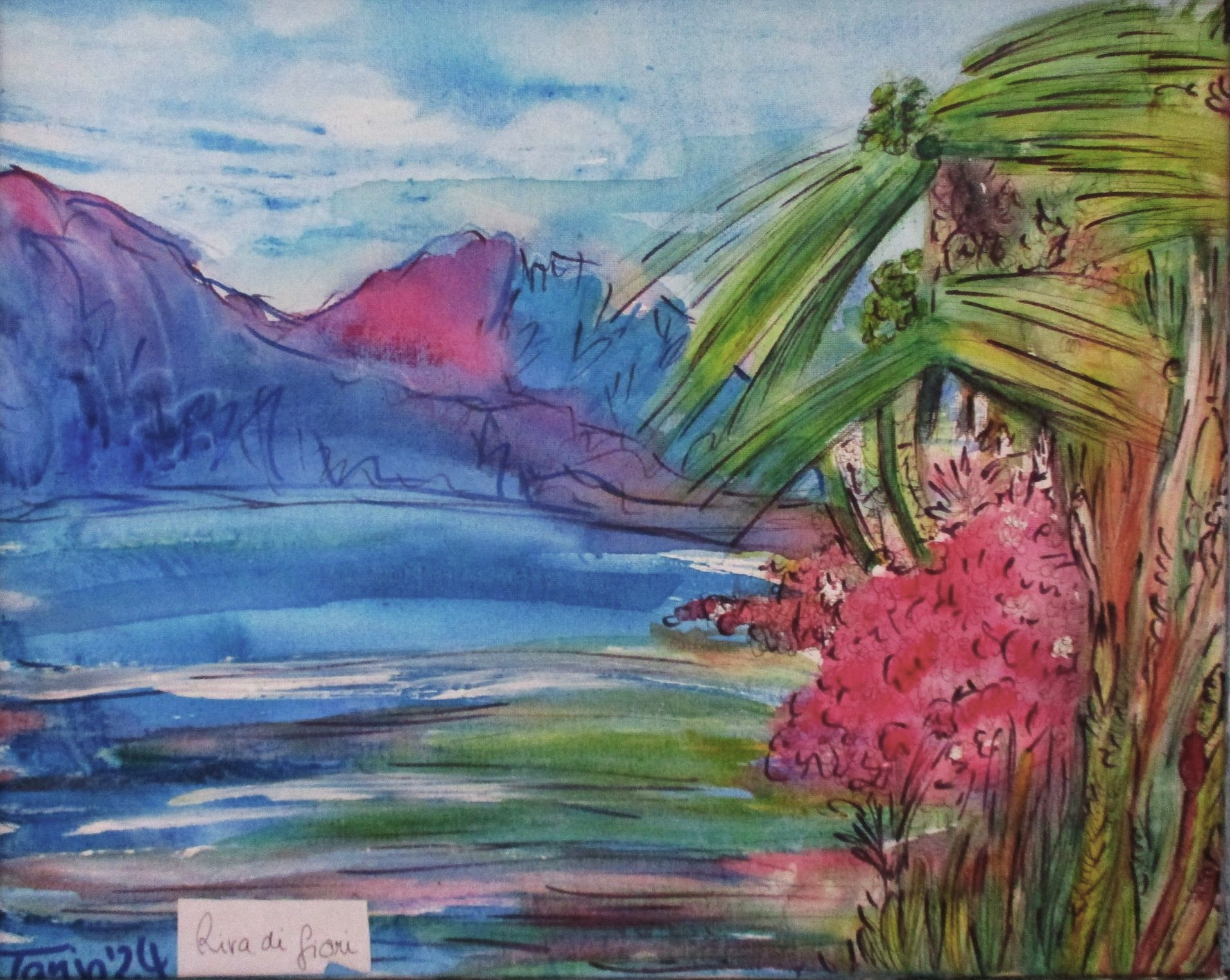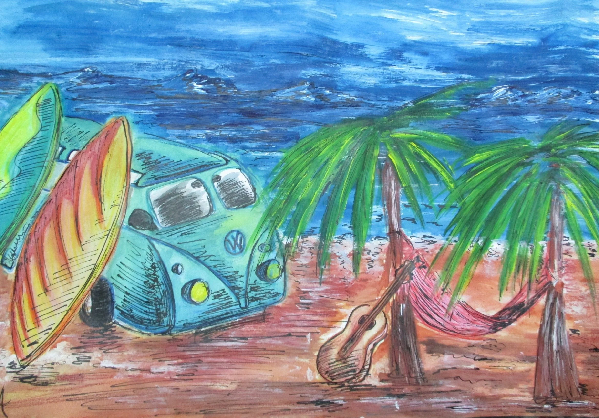 Auszeit am Strand, Wasserfarben und Acryl mit Fineliner auf Aquarellpapier, 30 x 40 cm, 120,-