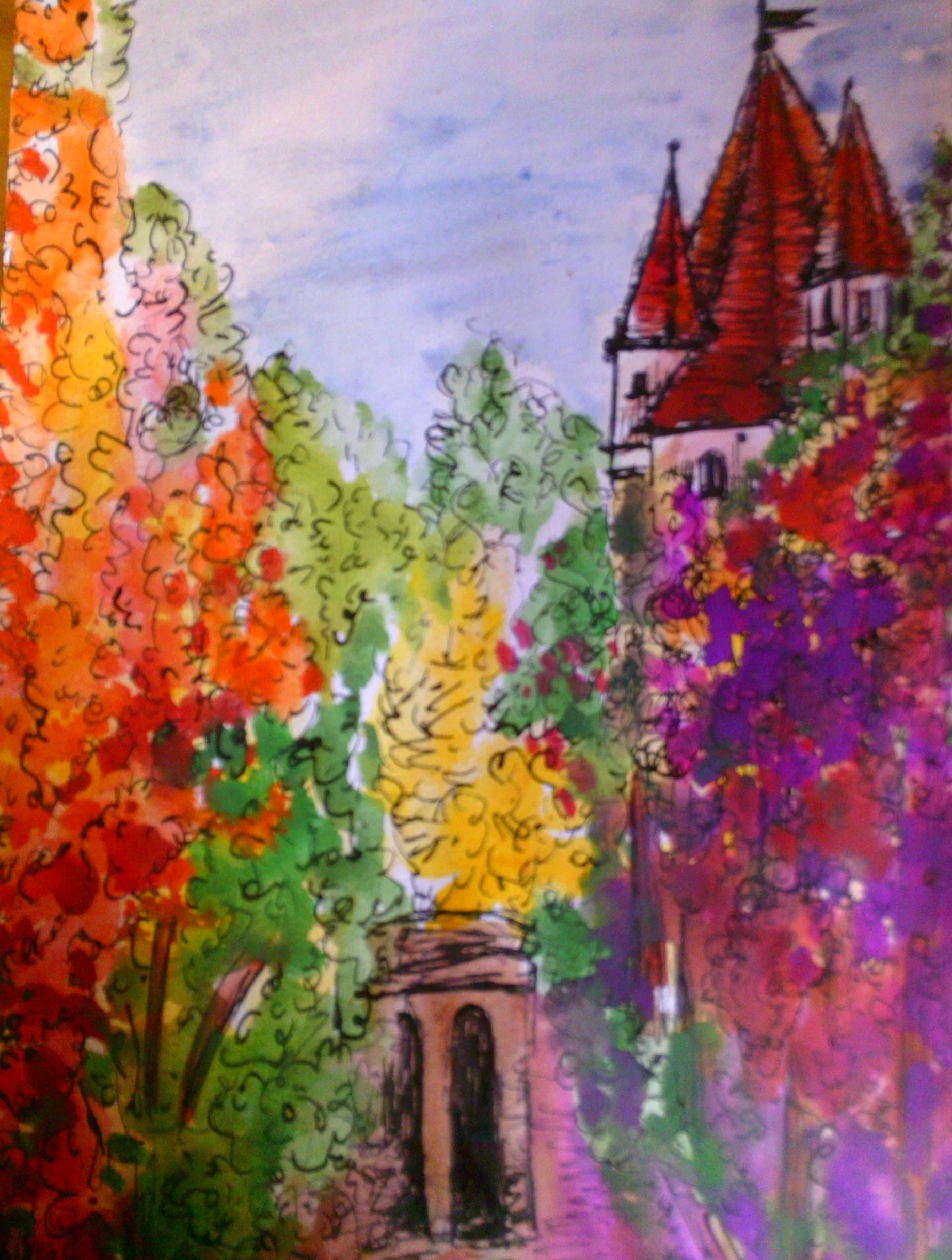 Haager Schlossturm im Herbst ODER Wohnt hier vielleicht Rapunzel? , Aquarell mit Tusche auf Aquarellpapier, 30 x30 cm, 85, -