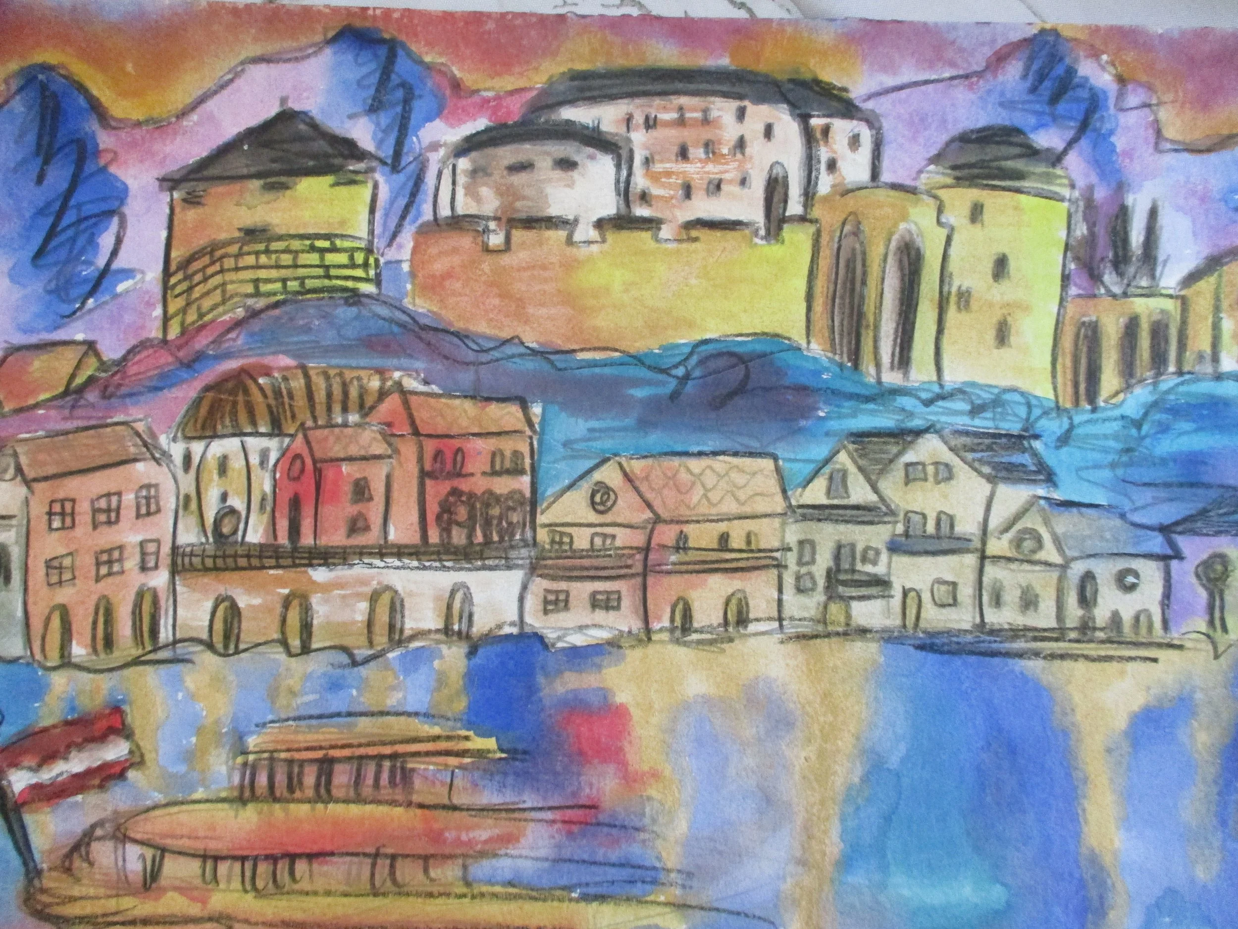 Burghausen, 19,5 x 24,5 cm Innenmaß, 27,5 x 35 cm Außenmaß, Wasserfarben mit Bleistift, auf Aquarellpapier mit Passepartout, 85,-