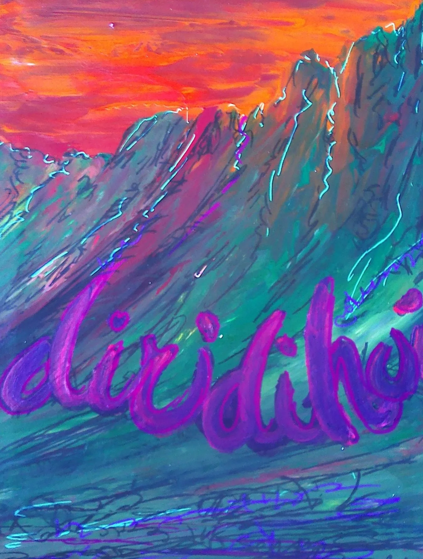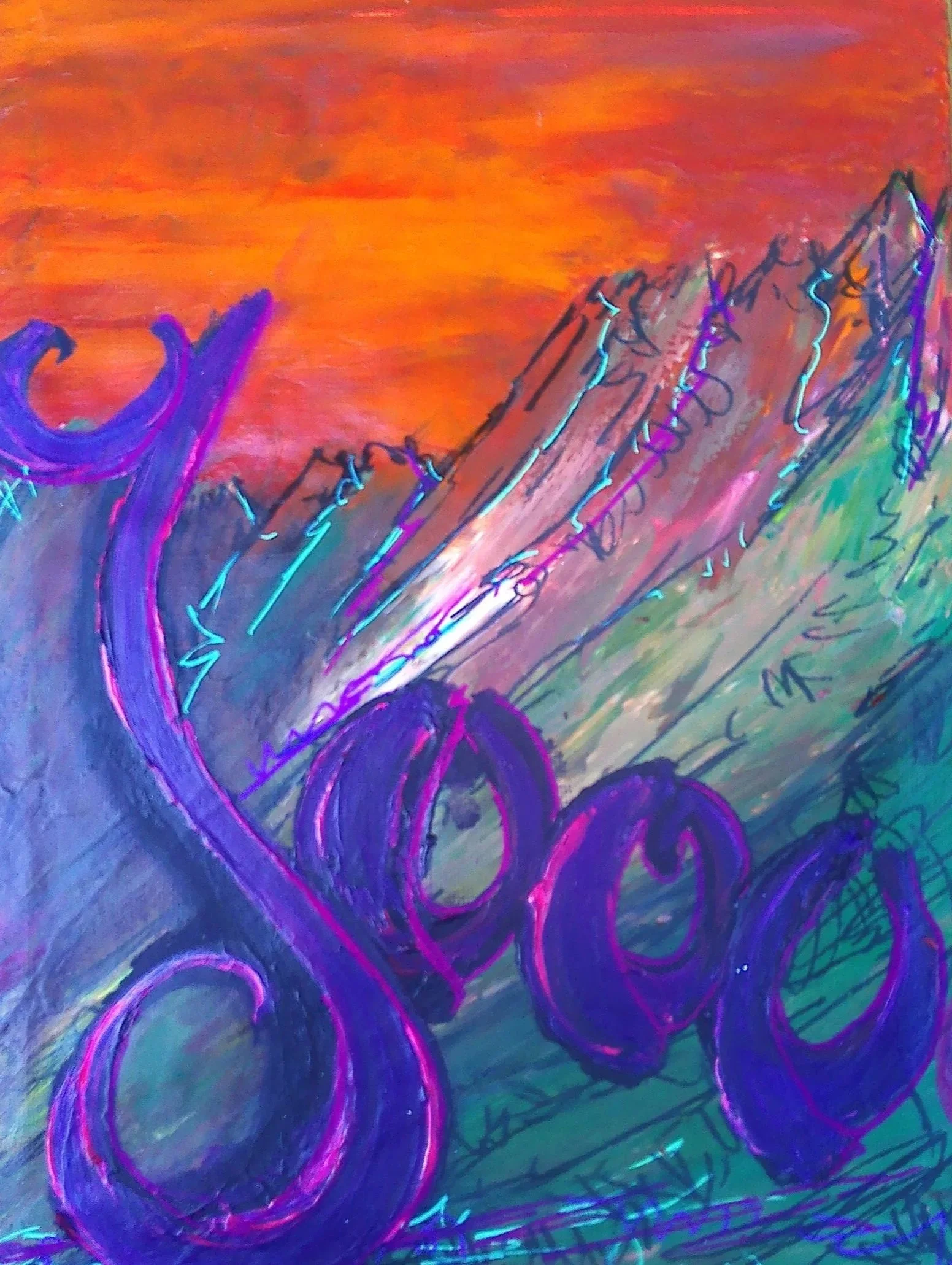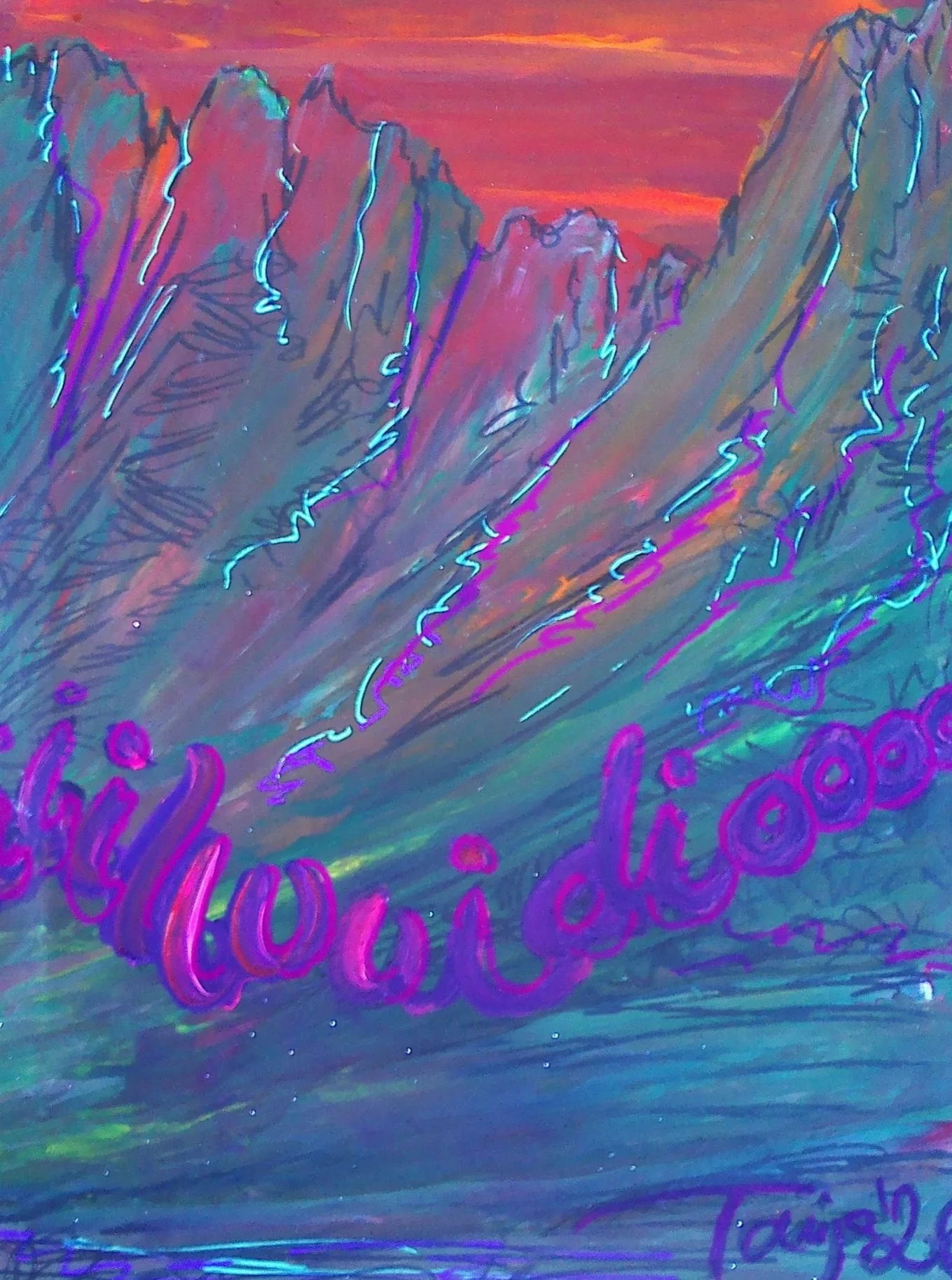 Musik über den Bergen, Aquarell mit Fineliner auf Leinwand, 30 x40 cm, 200, -
