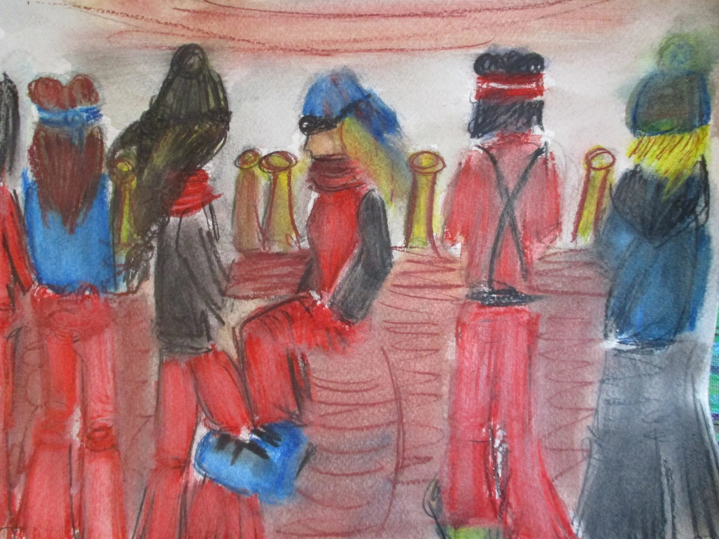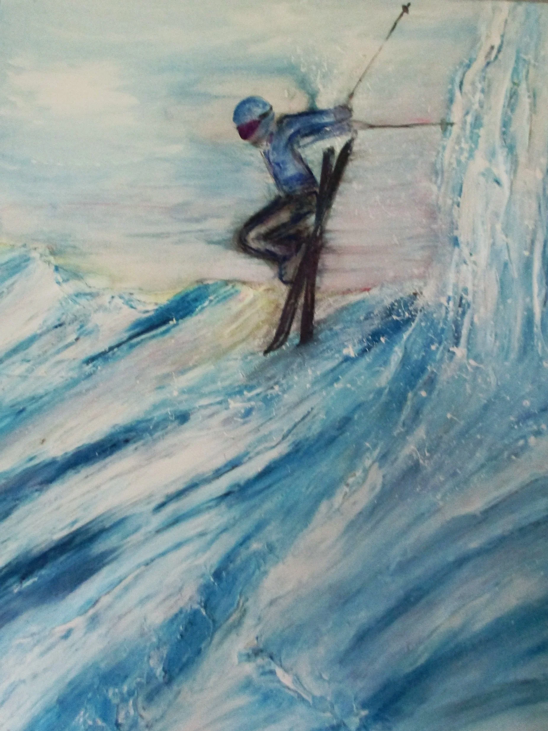 Feierabend nach einem Skischultag, 50 x 50cm, Acryl und Wasserfarben auf Leinwand, 140,-