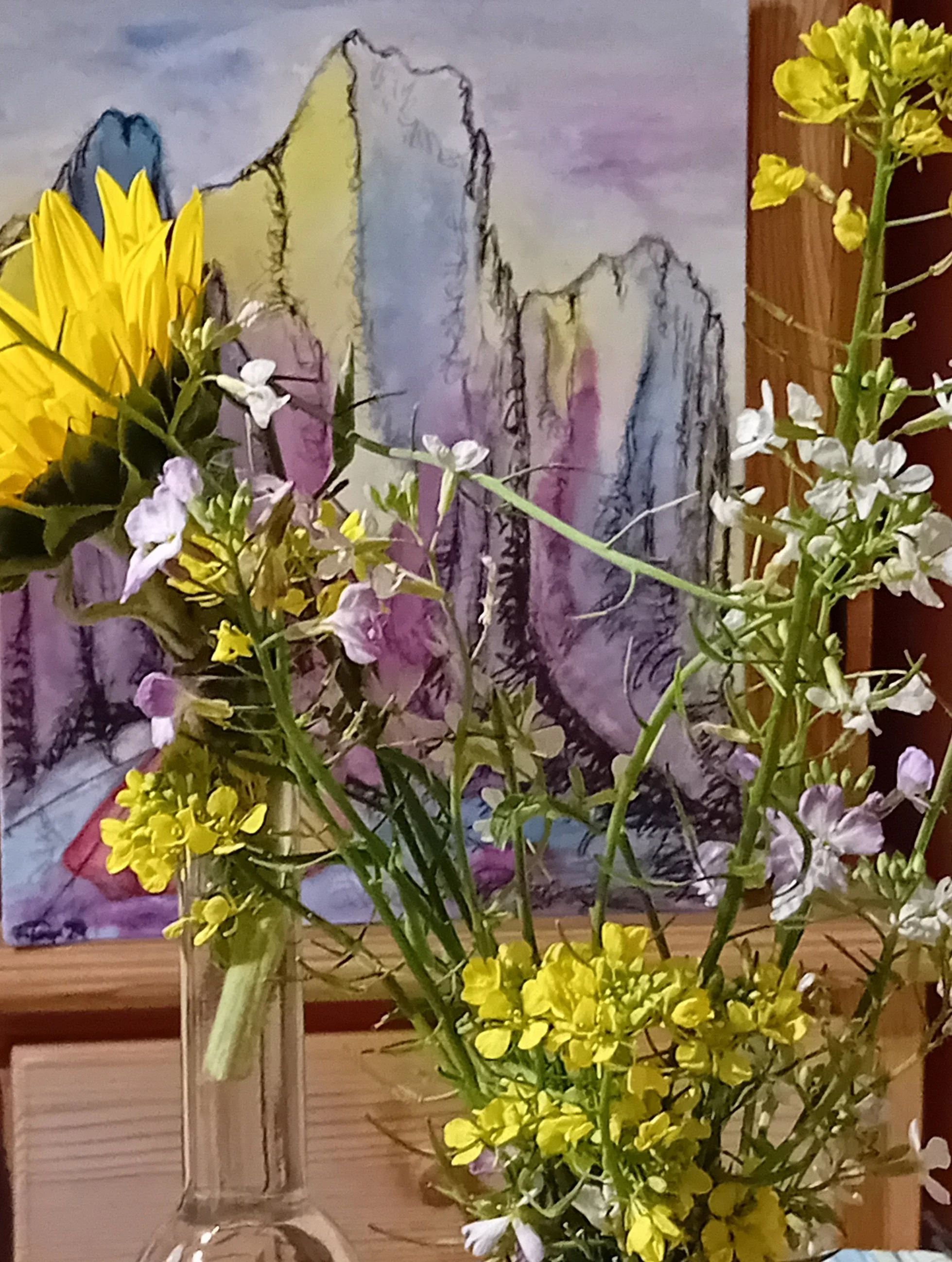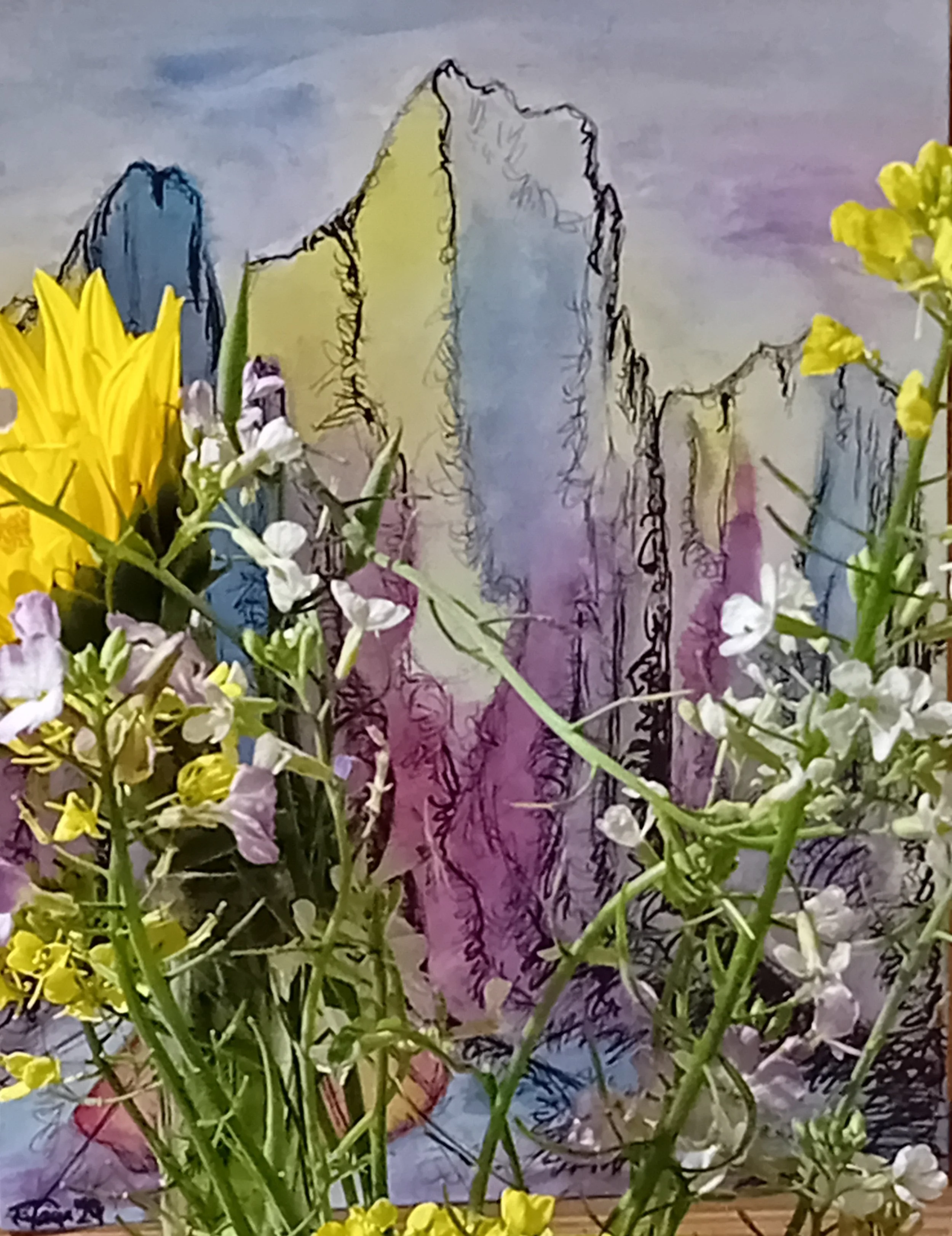 Berge und Mystik, Acryl und Aquarell mit Kugelschreiber auf Leinwand 30 x 40 cm, 350, -