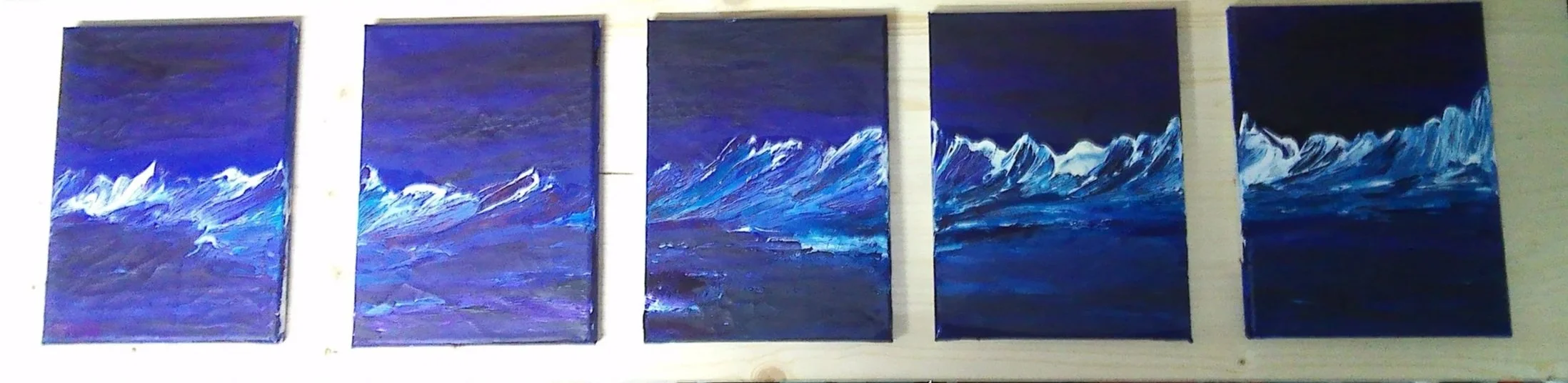 Bergfieber, Triologien, Acryl und Aquarell mit Kugelschreiber auf Leinwänden, je 20 x20 cm, nur zu dritt verkäuflich, zwischen 150, - und 200, -